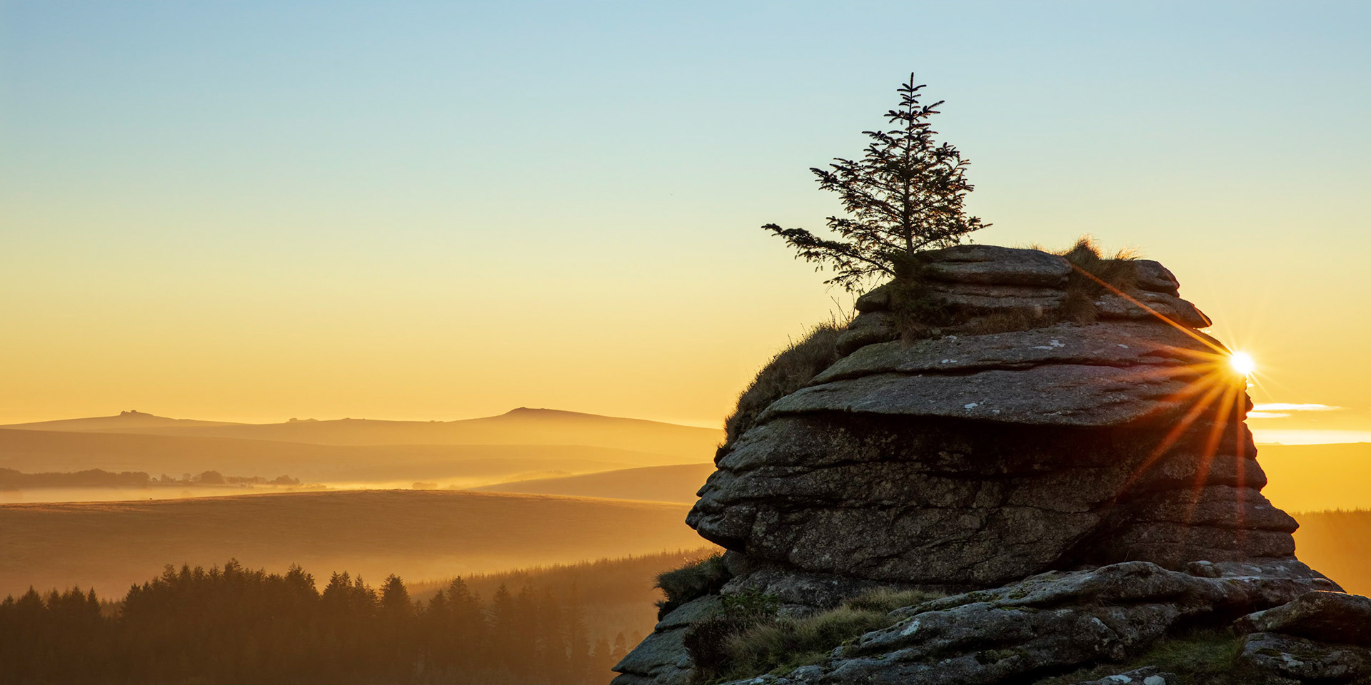 Sunrise over a hazy valley near Combestone Tor in Dartmoor National Park.