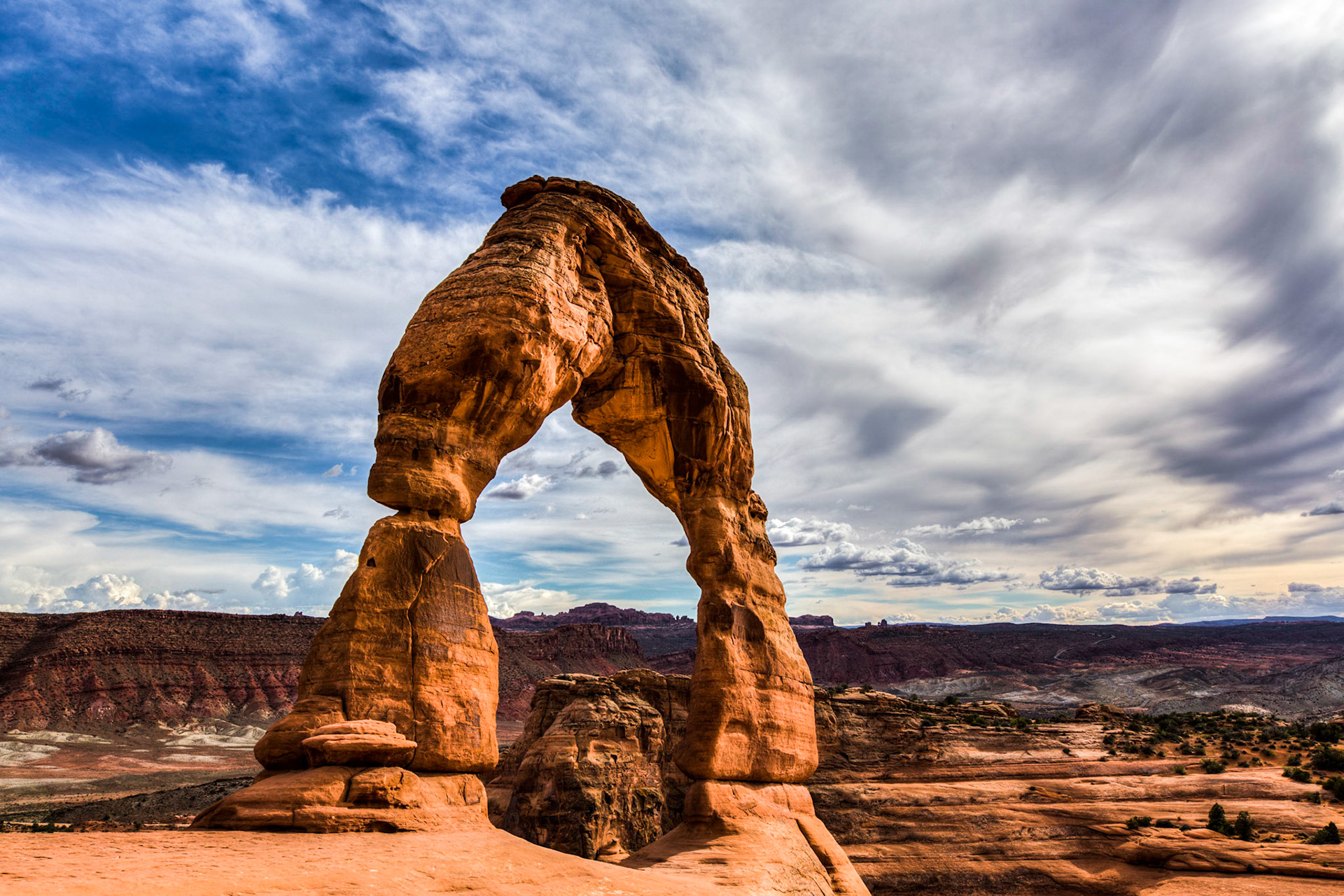 The sun bursting at the pinnacle of Cove Arch looking towards the windows section of Arches National Park, Utah, USA.